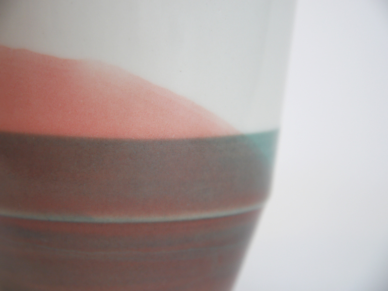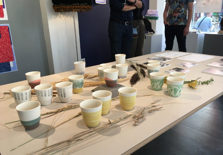De expositie was een mooie aanleiding om een idee, waar we al langer mee rondliepen, tot een eindresultaat te brengen. We zijn geïnspireerd geraakt door 5 kleine schilderijtjes ‘Weggeschilderd landschap’ van kunstenaar John van de Rijdt. Geïnspireerd door zijn schilderijtjes experimenteerden we met decoraties op een kopje.