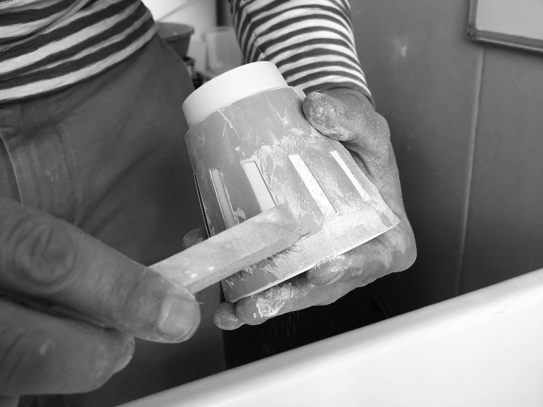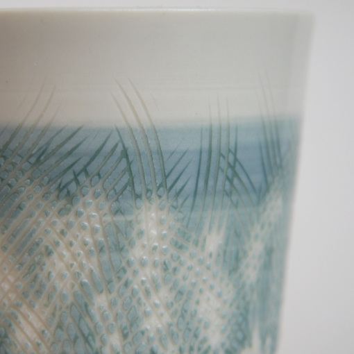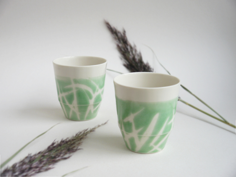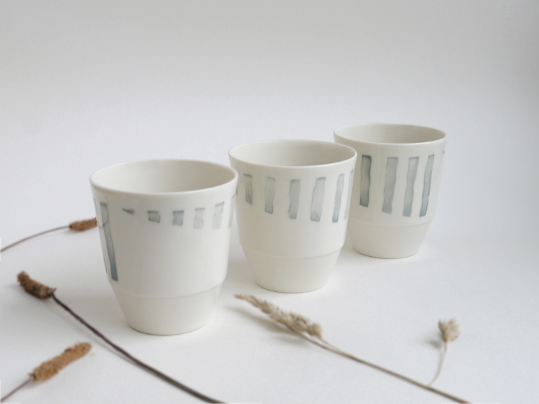 Het nastreven van perfectie en uniformiteit resulteert vaak in uitval in productie. Onregelmatigheden vallen bijvoorbeeld sneller op. In deze serie kopjes hebben we dit tegen willen gaan. Door het oppervlak met de hand te bewerken hebben we juist gebruik gemaakt van onregelmatigheden. Het verhoogt de ‘levendige’ uitstraling, omdat er meer diepte ontstaat en het oppervlakte een tactiele kwaliteit krijgt.